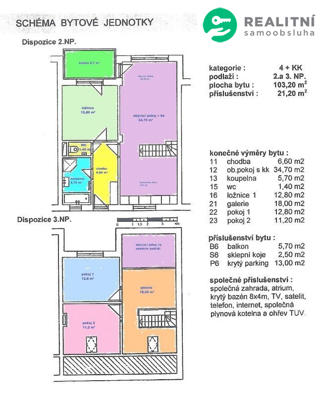 Byt o ploše 103m² má 8 místnosti: chodbu 6,6m², koupelnu 5,7m², WC 1.4m², obývací pokoj s kuchyňským koutem 34.7m², 1. ložnici 12,8 m², galerii 18.8m², 2. ložnici 12,8 m², 3. ložnici 11,2m². K bytu přísluší balkon 5,7m², sklep 2,5m², kryté parkovací stání. Byt je v 1. poschodí cihlového domu. Rok kolaudace 2009.