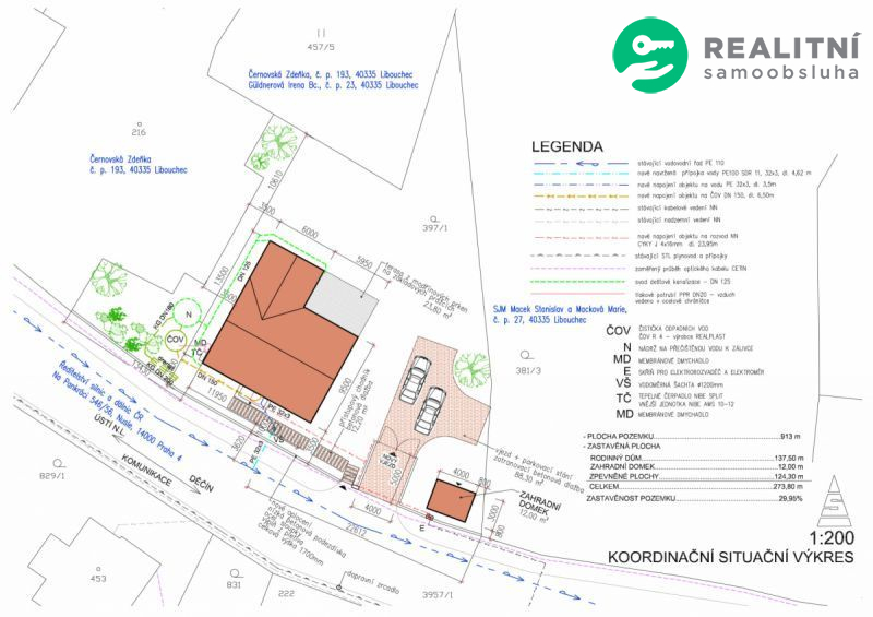 Elektřina je na pozemek již přivedena, voda se nachází na hranici pozemku.